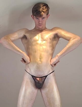 Here I am Ladies & Gentlemen.being very cocky and very cheeky flexing and posing for you in my tiny posers with oil and body paint mixed in. I know you like It messy!!